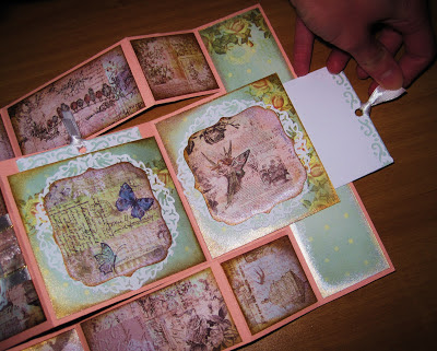 Много я харесвам тази конструкция на картичка, а ти си добавила нови елементи - тагчета и се е получило още по-ефектно. Освен това какво по-триизмерно въздествие, тя самата картичка е с няколко плана.